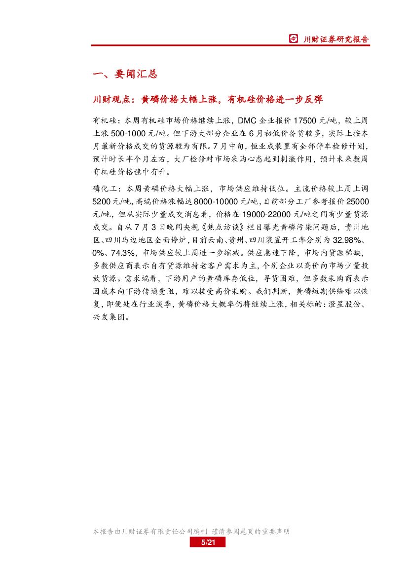 川财证券:基础化工行业周报:黄磷价格大幅上涨,有机硅价格进一步反弹.pdf