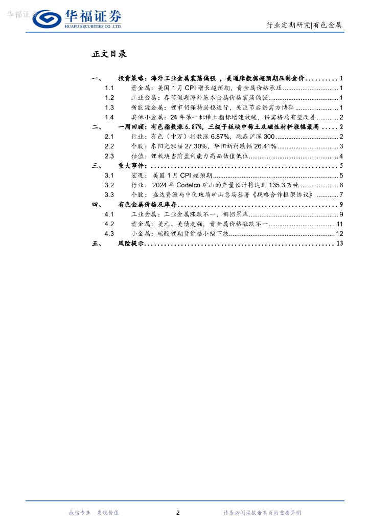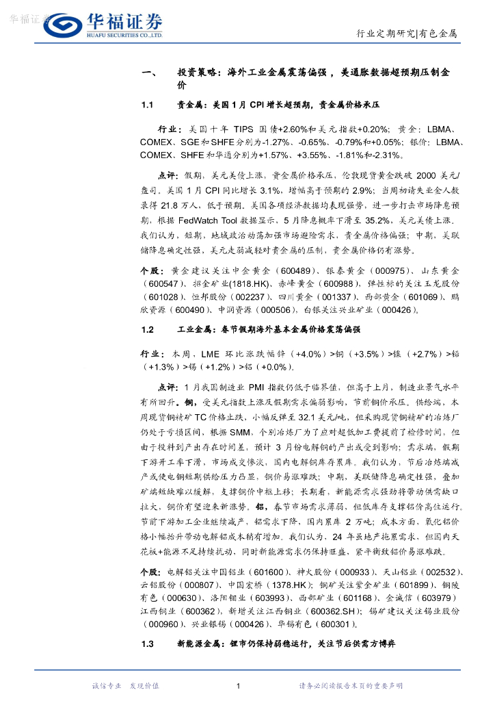 华福证券:有色金属行业周报:海外工业金属震荡偏强,美通胀数据超预期压制金价.pdf