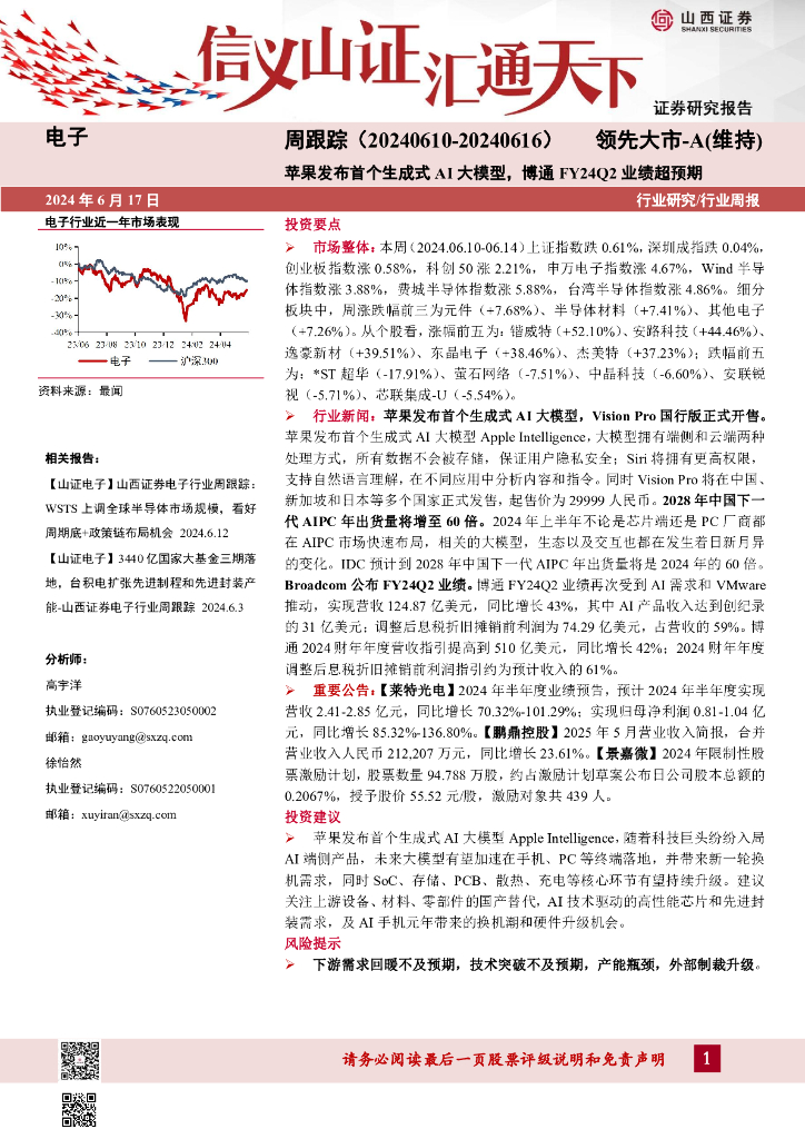 山西证券:电子周跟踪:苹果发布首个生成式AI大模型,博通FY24Q2业绩超预期.pdf