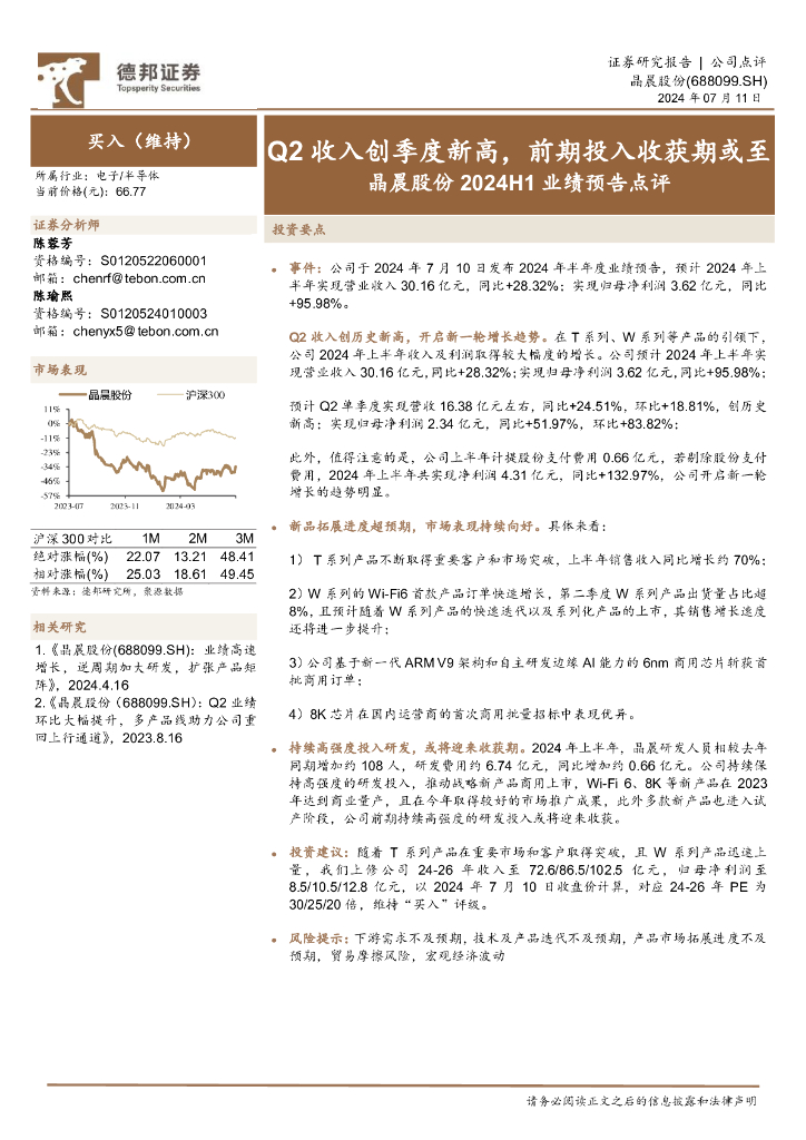 德邦证券:晶晨股份2024H1业绩预告点评:Q2收入创季度新高,前期投入收获期或至.pdf