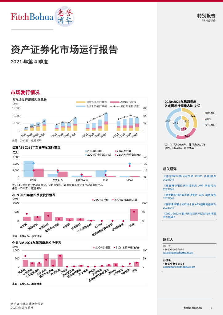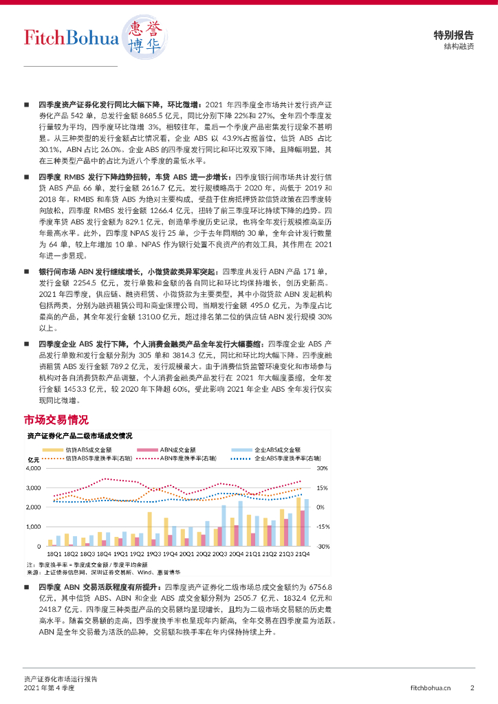 四季度资产证券化发行同比大幅下降,环比微增:2021年四季度全市场共计发行资产证券化产品542单,总发行金额8685.5亿元,同比分别下降22%和27%,全年四">