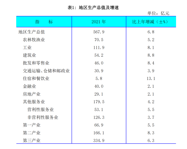 初步核算,2021年,全市实现地区生产总值(GDP)567.9亿元,按可比价格计算,比上年增长6.8%。其中,第一产业增加值 66.9亿元,增长5.5%;第二产业增加值166.1亿元,增长8.3%;第三产业增加值334.9亿元,增长6.3%。人均GDP达37080元,比上年增长7.3%。[2]