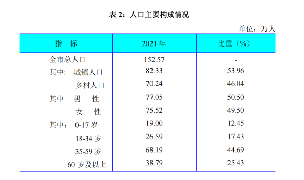 2021年末,全市户籍总人口为152.57万人,比上年末减少1.17万人。全年出生人口5709人,出生率为3.73‰,比上年下降1.09个千分点;死亡人口7706人,死亡率为5.03‰,比上年下降8.21个千分点;人口自然增长率为-1.30‰,比上年上升7.12个千分点。