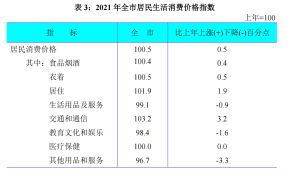 全年居民消费价格比上年上涨0.5%,八大类指标呈四涨一平三降态势。食品烟酒类价格上涨0.4%,衣着类价格上涨0.5%,居住类价格上涨1.9%,生活用品及服务类价格下降0.9%,交通和通信类价格上涨3.2%,教育文化和娱乐类价格下降1.6%,医疗保健类价格持平,其他用品和服务类价格下降3.3%。