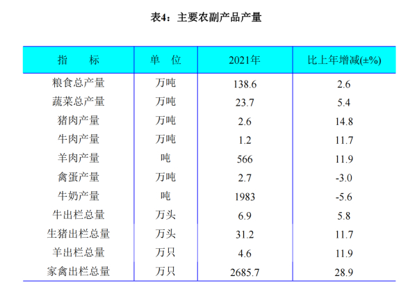 全年牛出栏总量达6.9万头,比上年增长5.8%;生猪出栏总量达31.2万头,增长11.7%;家禽出栏总量达2685.7万只,增长28.9%;羊出栏总量达4.6万只,增长11.9%。猪肉产量2.6万吨,增长14.8%;牛肉产量1.2万吨,增长11.7%;羊肉产量566吨,增长11.9%;禽蛋产量2.7万吨,下降3.0%;牛奶产量1983吨,下降5.6%。