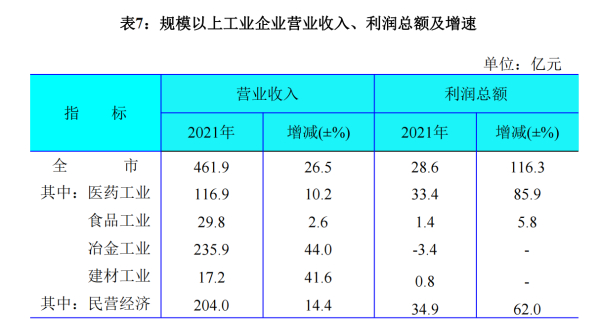 全年全市规模以上工业实现利润28.6亿元,比上年增长116.3%。其中,三大支柱行业实现利润31.4亿元,增长143.4%;全市规模以上工业实现营业收入461.9亿元,比上年增长26.5%。其中,医药、食品和冶金工业实现营业收入382.6亿元,增长28.0%。