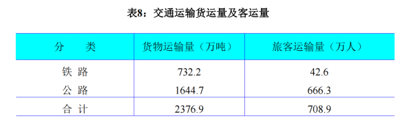 全年完成货物运输量2376.9万吨,其中,铁路运输完成货物发运量732.2万吨,公路运输完成货物发运量1644.7万吨;全年完成旅客运输量708.9万人,其中,铁路运输完成旅客运输量42.6万人,公路运输完成旅客运输量666.3万人。