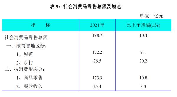 全年实现社会消费品零售总额198.7亿元,同比增长10.4%,增幅比上年同期提高19.7个百分点。