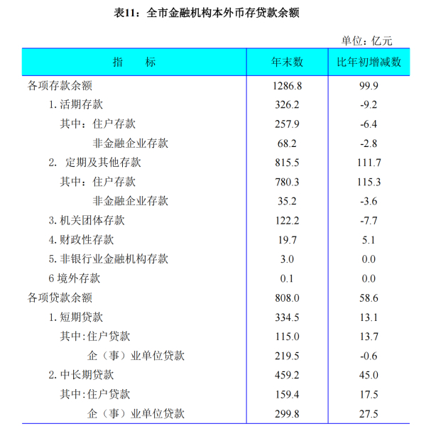 全年全市金融业实现增加值40.0亿元,比上年增长2.1%。全市金融机构本外币各项存款余额1286.8亿元,比年初增加99.9亿元。其中,活期存款326.2亿元,比年初减少9.2亿元;定期及其他存款815.5亿元,比年初增加111.7亿元。金融机构本外币各项贷款余额808.0亿元,比年初增加58.6亿元。其中,短期贷款余额334.5亿元,比年初增加13.1亿元;中长期贷款余额459.2亿元, 比年初增加45.0亿元。