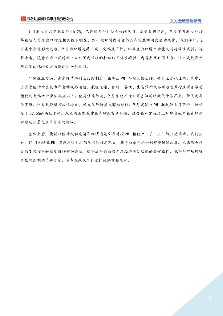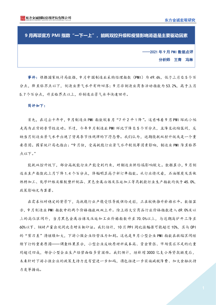东方金诚:9月两项官方PMI指数“一下一上”,能耗双控升级和疫情影响消退是主要驱动因素-2021年9月PMI数据点评.pdf