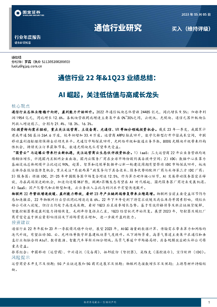 国金证券:通信行业22年&1Q23业绩总结:AI崛起,关注低估值与高成长龙头.pdf