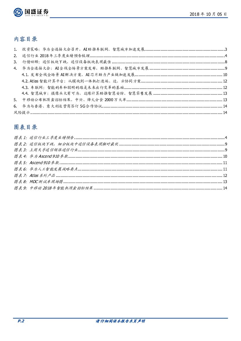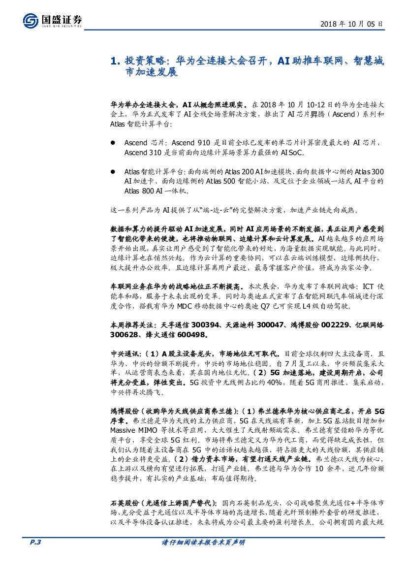 国盛证券:通信行业周报:华为全连接大会召开,AI助推车联网、智慧城市加速发展.pdf