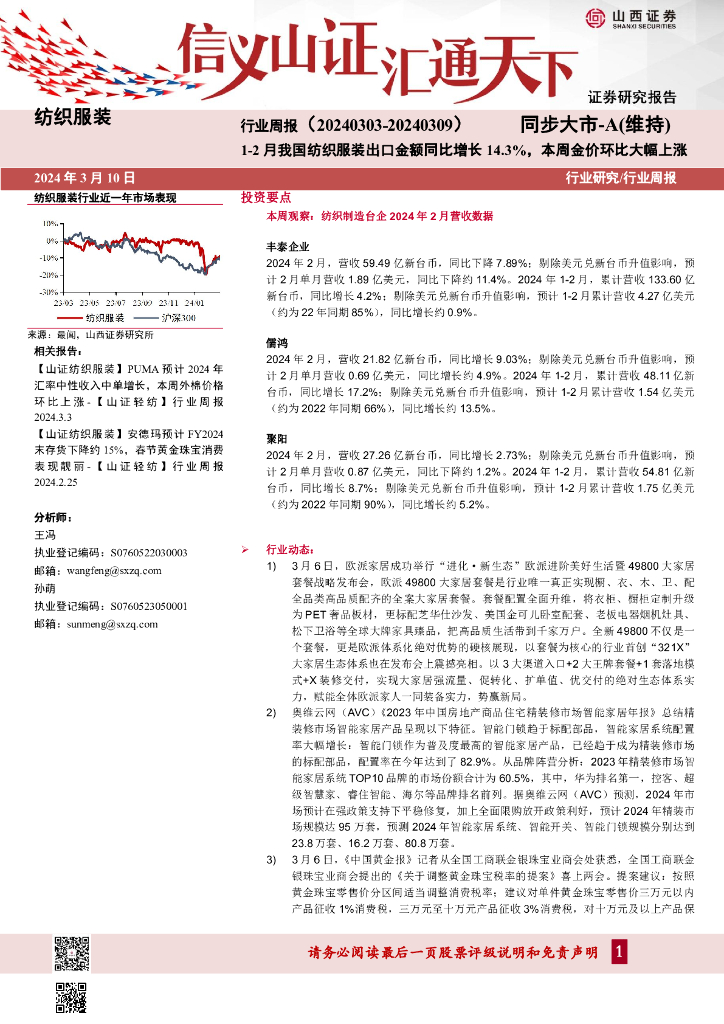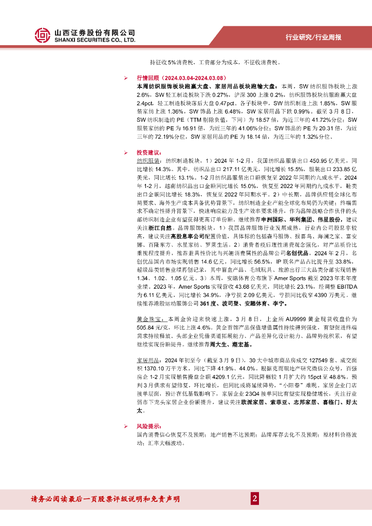 山西证券:行业周报(:1-2月我国纺织服装出口金额同比增长14.3%,本周金价环比大幅上涨.pdf