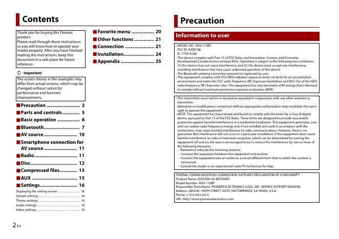 Pioneer AVH-110BT DVD RDS AV RECEIVER用户手册.pdf