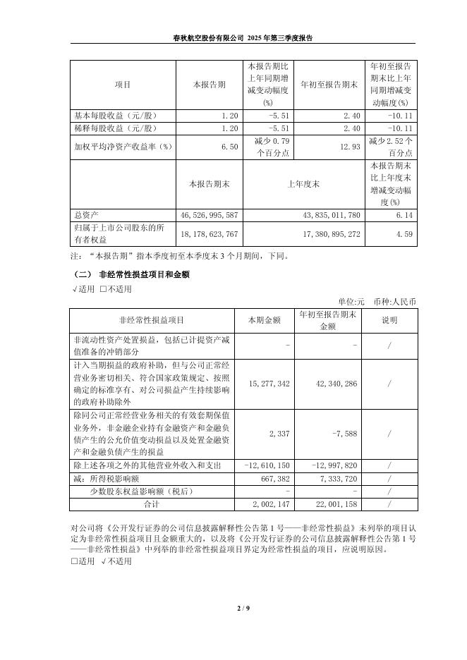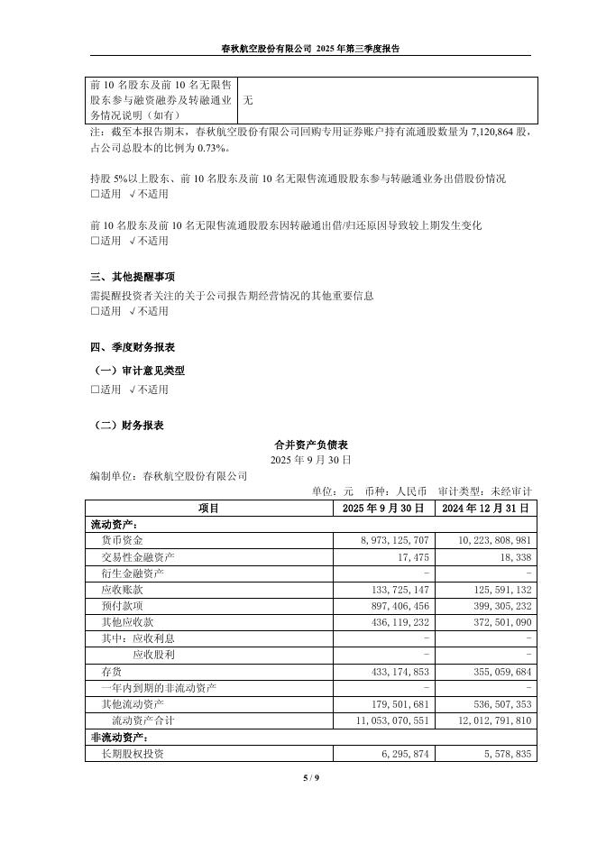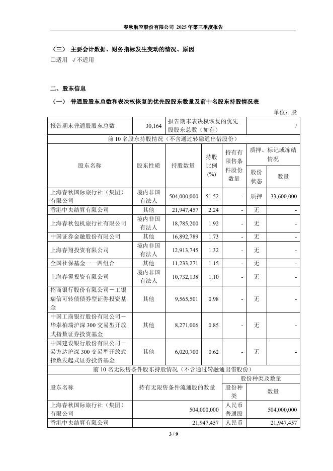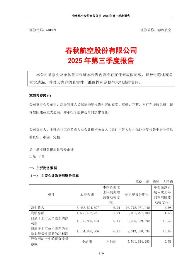 601021-春秋航空:春秋航空2025年第三季度报告.pdf