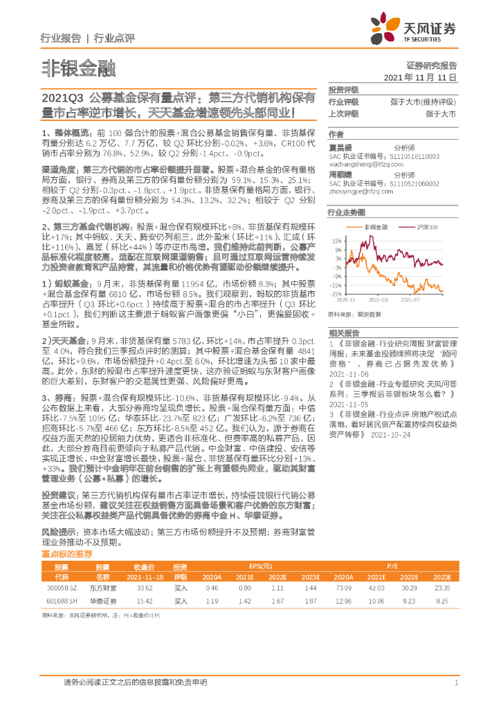 天风证券:非银金融:2021Q3公募基金保有量点评:第三方代销机构保有量市占率逆市增长,天天基金增速领先头部同业!.pdf