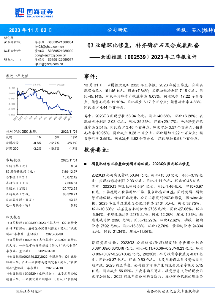 国海证券:云图控股(002539)-2023年三季报点评:Q3业绩环比修复,补齐磷矿石及合成氨配套.pdf
