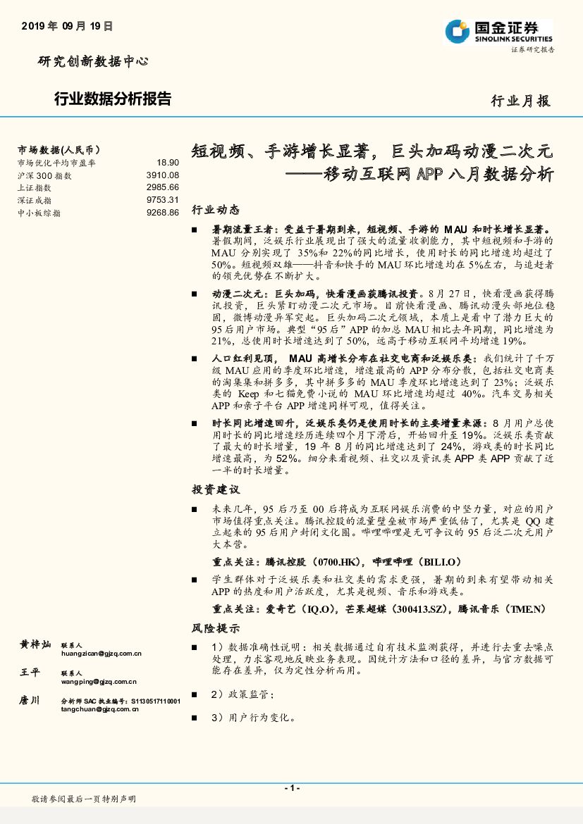 国金证券:移动互联网APP八月数据分析:短视频、手游增长显著,巨头加码动漫二次元.pdf