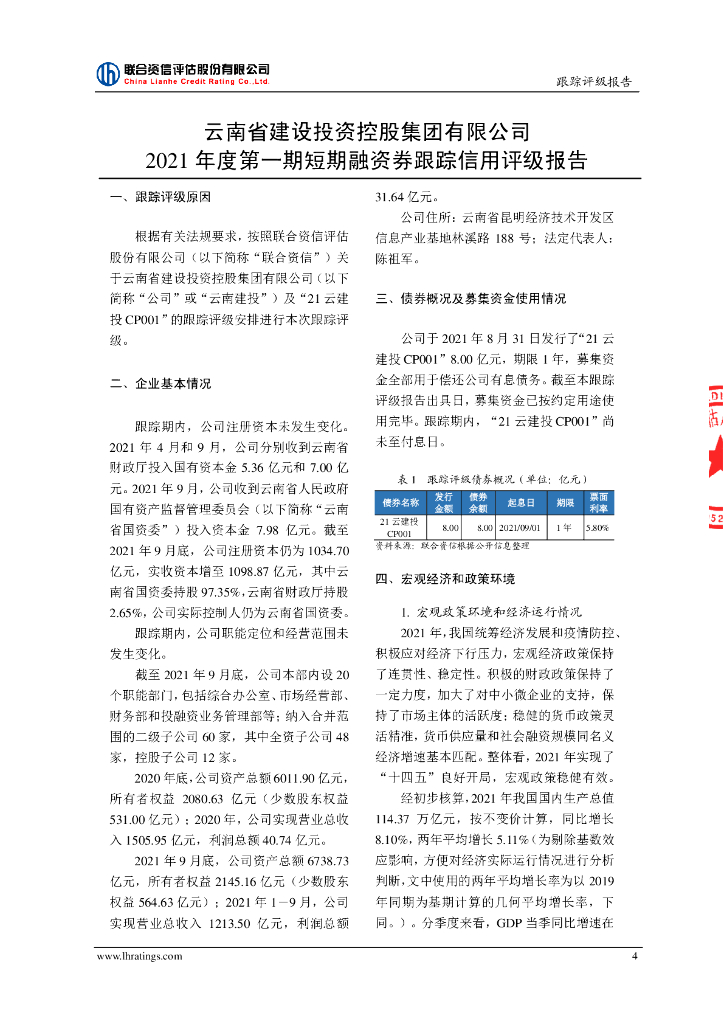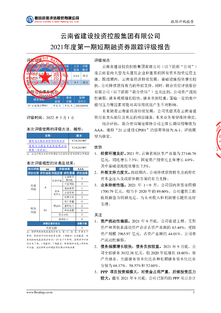 联合资信:云南省建设投资控股集团有限公司2021年度第一期短期融资券跟踪评级报告.pdf