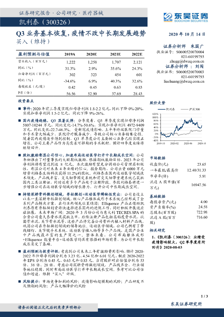 东吴证券:凯利泰(300326)-Q3业务基本恢复,疫情不改中长期发展趋势.pdf