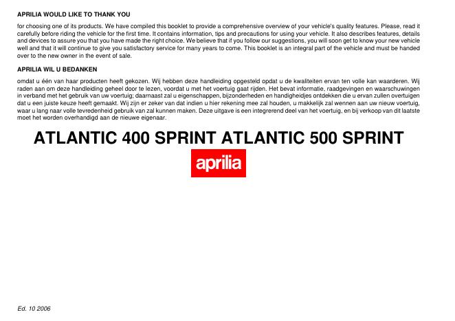 aprilia 8181097 ATLANTIC 400 SPRINT- ATLANTIC 500 SPRINT UK-NL MY 2006 使用手册.pdf