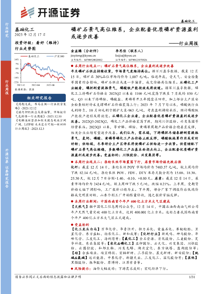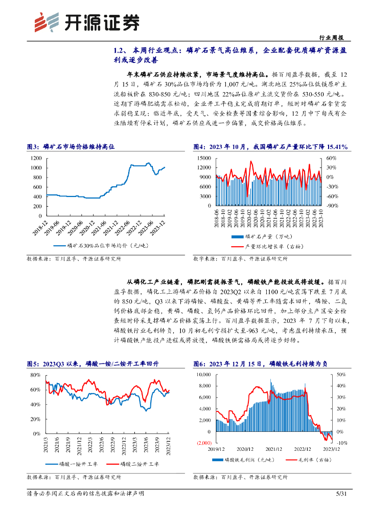 开源证券:基础化工行业周报:磷矿石景气高位维系,企业配套优质磷矿资源盈利或逐步改善.pdf