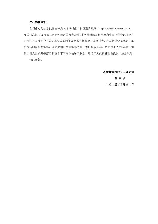 300209-有棵树:关于2025年第三季度报告部分数据的公告.pdf