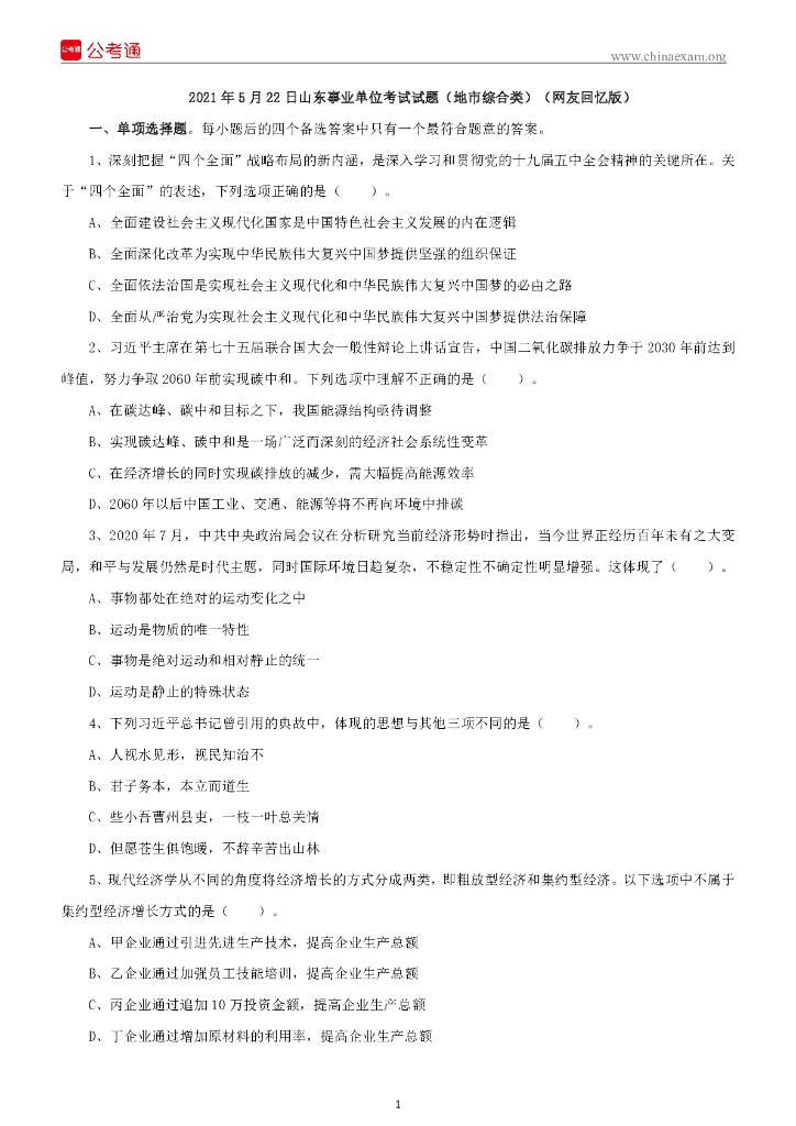 2021年5月22日山东事业单位考试试题(地市综合类).pdf