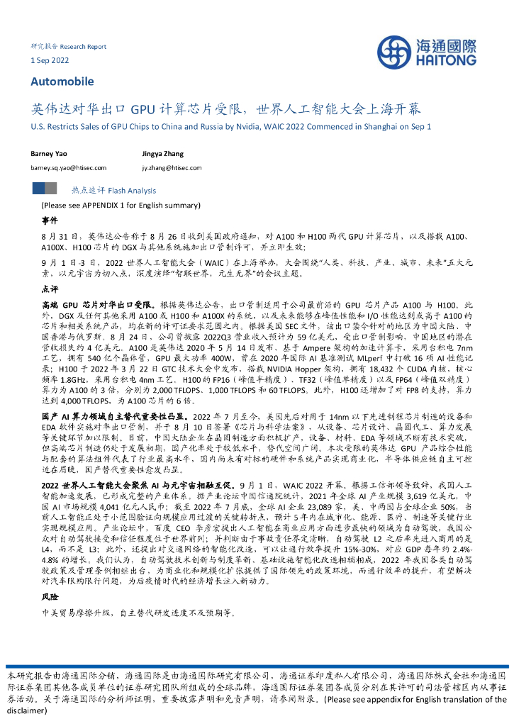海通国际:汽车行业:英伟达对华出口GPU计算芯片受限,世界人工智能大会上海开幕.pdf
