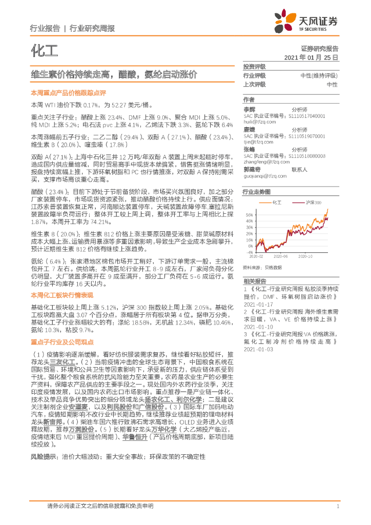 天风证券:化工行业研究周报:维生素价格持续走高,醋酸,氨纶启动涨价.pdf
