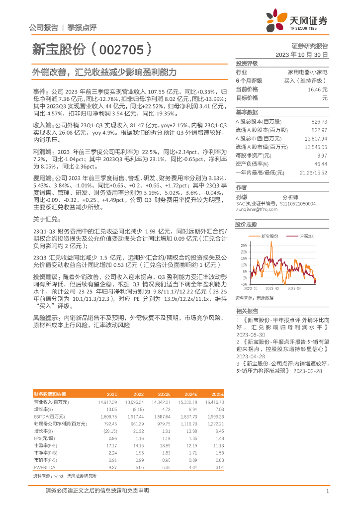 天风证券:新宝股份(002705)-外销改善,汇兑收益减少影响盈利能力.pdf