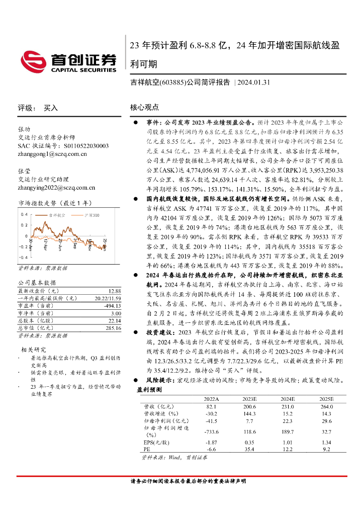 首创证券:吉祥航空(603885)-公司简评报告:23年预计盈利6.8-8.8亿,24年加开增密国际航线盈利可期.pdf