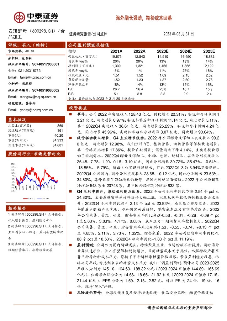 中泰证券:安琪酵母(600298)-海外增长强劲,期待成本回落.pdf