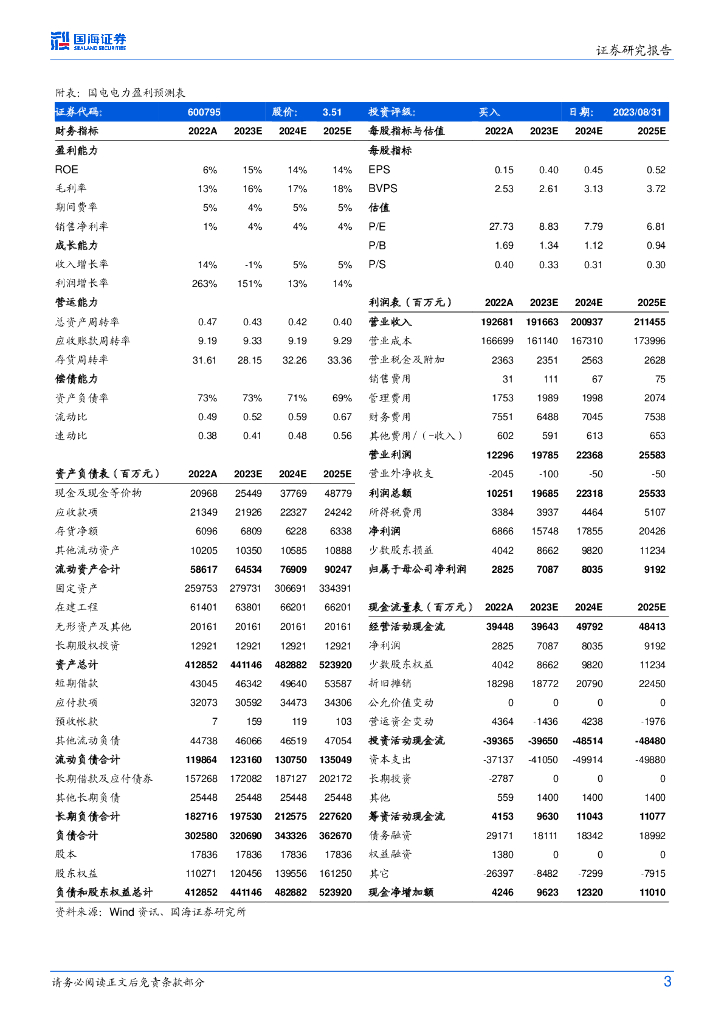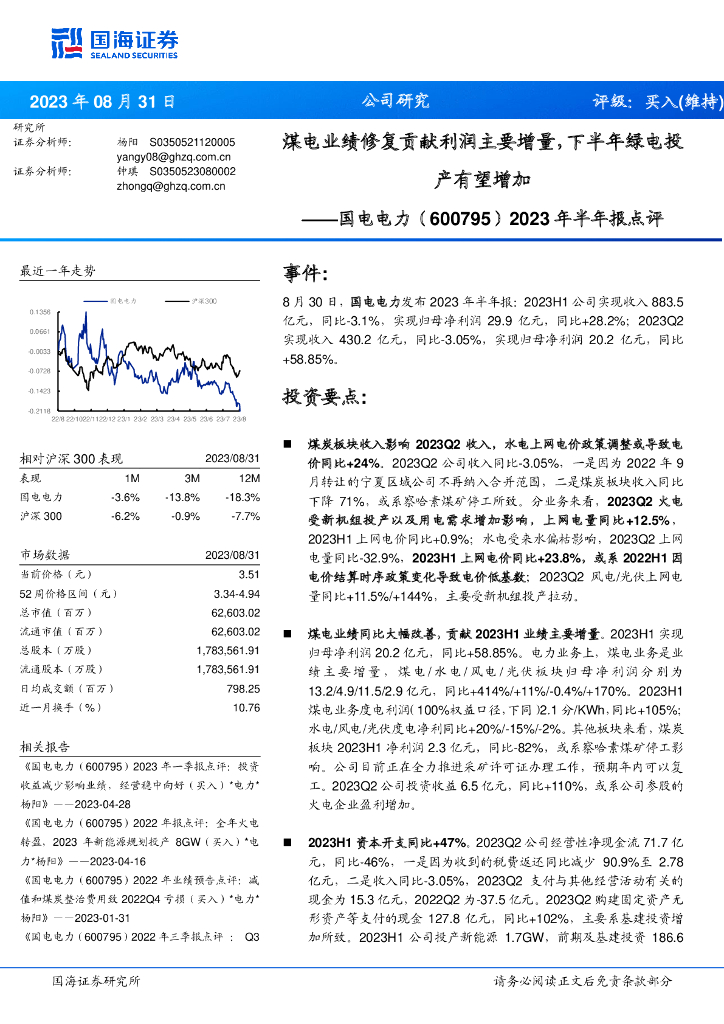 国海证券:国电电力(600795)-2023年半年报点评:煤电业绩修复贡献利润主要增量,下半年绿电投产有望增加.pdf