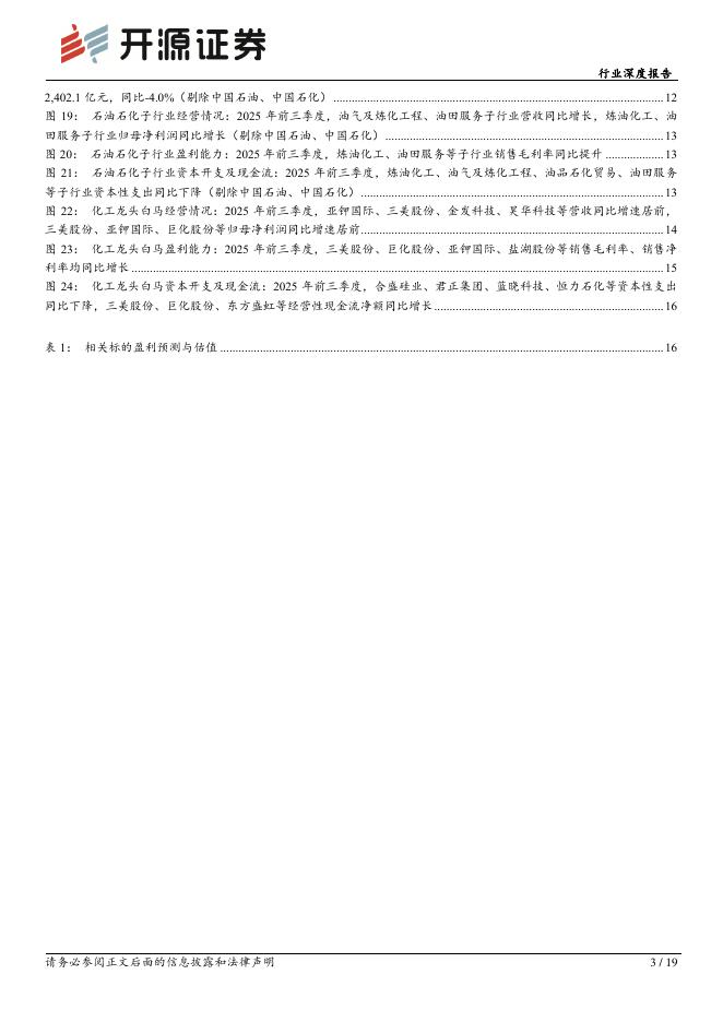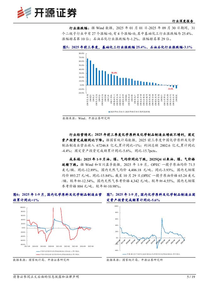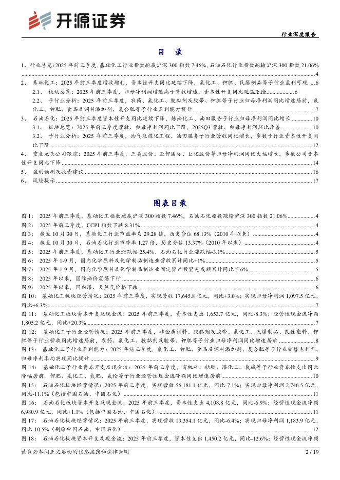 开源证券:化工行业2025年三季报总结报告:基础化工增收增利,石油石化减收减利,行业资本性开支延续下降,氟化工、农化、炼油化工等盈利可观.pdf
