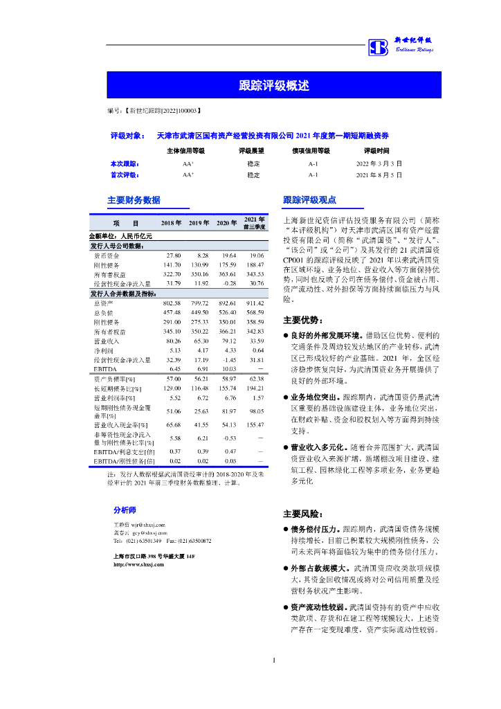 新世纪:天津市武清区国有资产经营投资有限公司2021年度第一期短期融资券跟踪评级报告.pdf