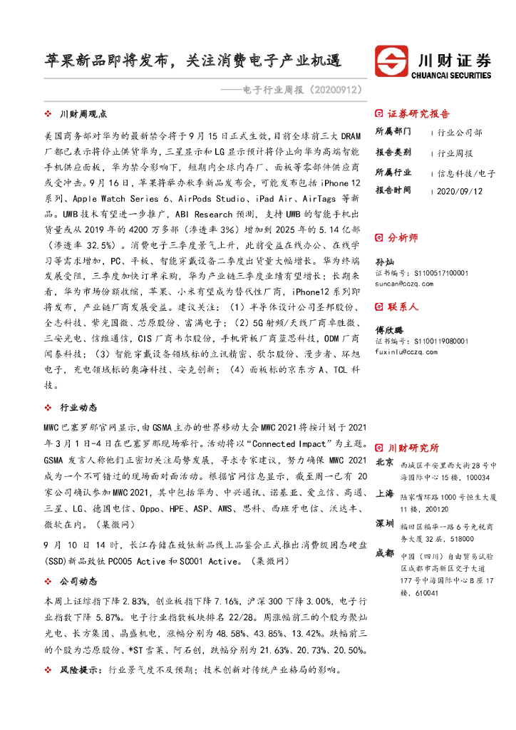 川财证券:电子行业周报:苹果新品即将发布,关注消费电子产业机遇.pdf