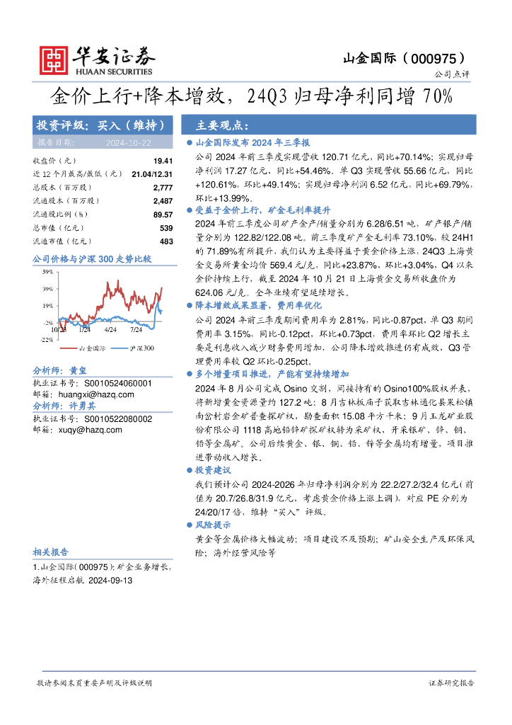 华安证券:山金国际(000975)-金价上行+降本增效,24Q3归母净利同增70%.pdf