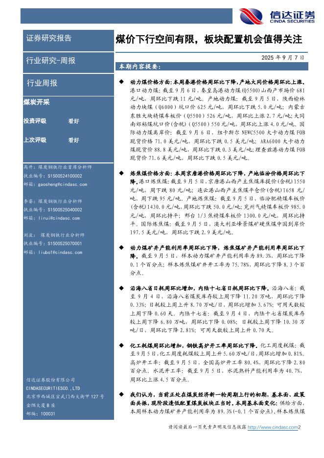 信达证券:煤炭开采行业周报:煤价下行空间有限,板块配置机会值得关注.pdf