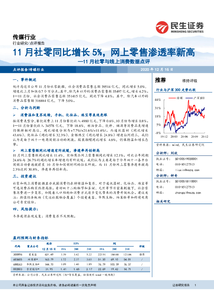 民生证券:传媒行业:11月社零与线上消费数据点评-11月社零同比增长5%,网上零售渗透率新高.pdf