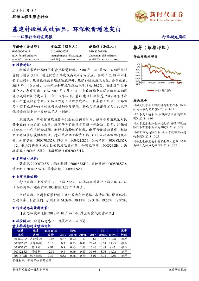 新时代证券:环保行业研究周报:基建补短板成效初显,环保投资增速突出.pdf