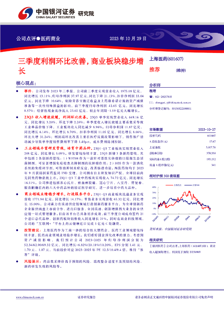 中国银河:上海医药(601607)-三季度利润环比改善,商业板块稳步增长.pdf