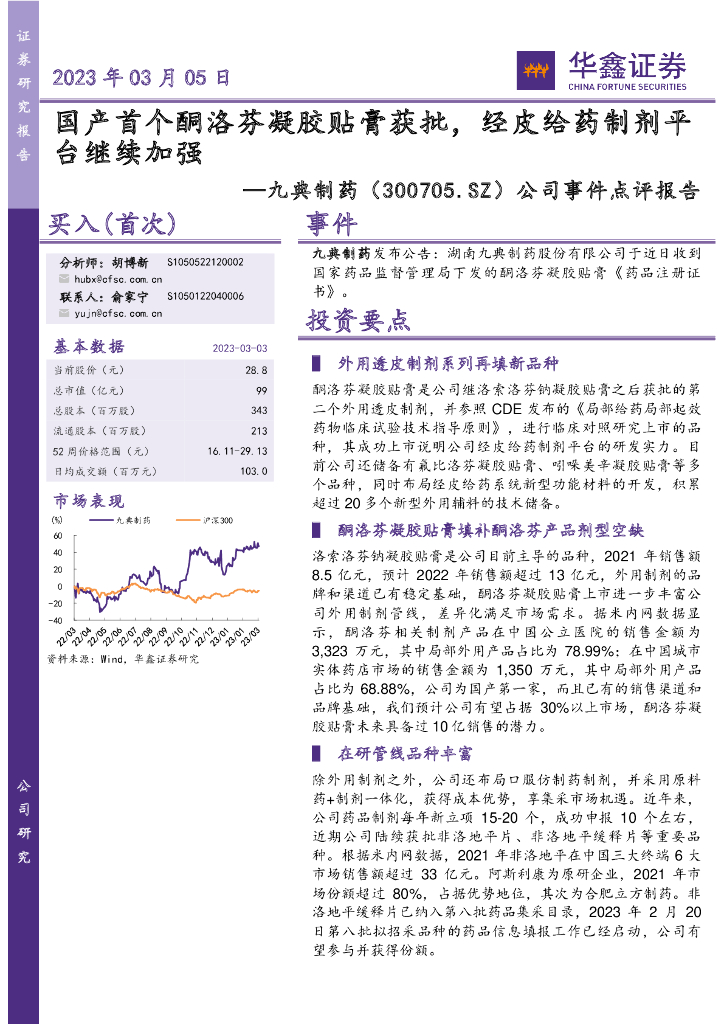 华鑫证券:九典制药(300705)-公司事件点评报告:国产首个酮洛芬凝胶贴膏获批,经皮给药制剂平台继续加强.pdf