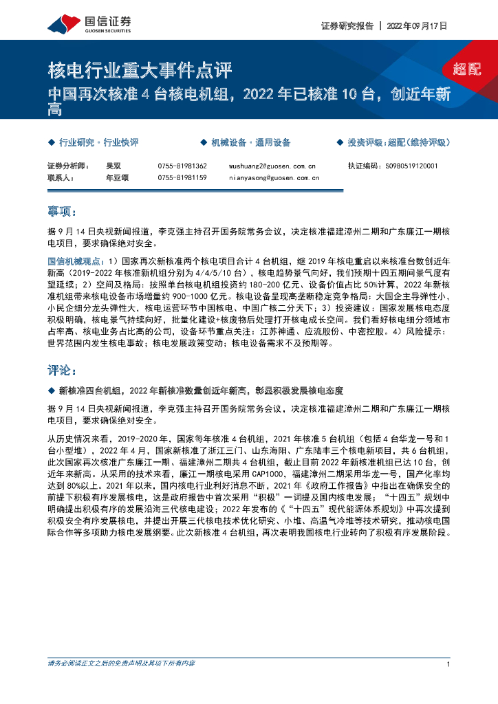 国信证券:核电行业重大事件点评:中国再次核准4台核电机组,2022年已核准10台,创近年新高.pdf