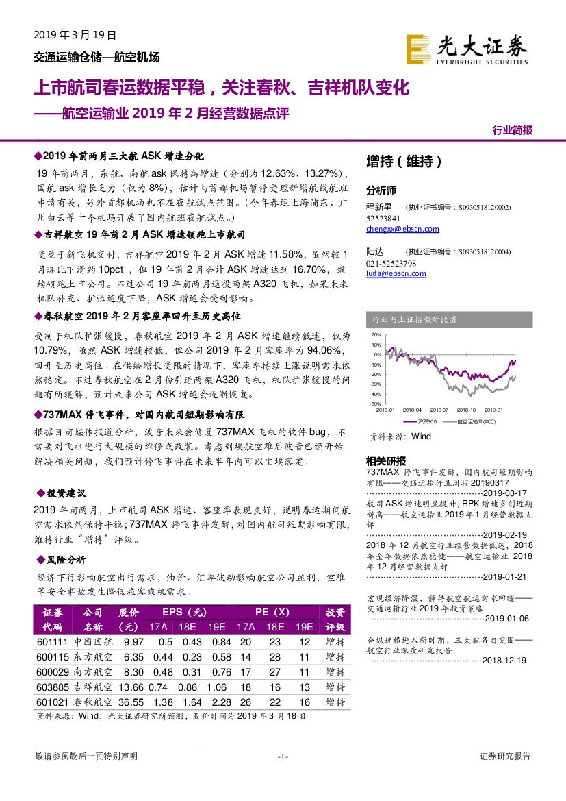 光大证券:航空运输业2019年2月经营数据点评:上市航司春运数据平稳,关注春秋、吉祥机队变化.pdf