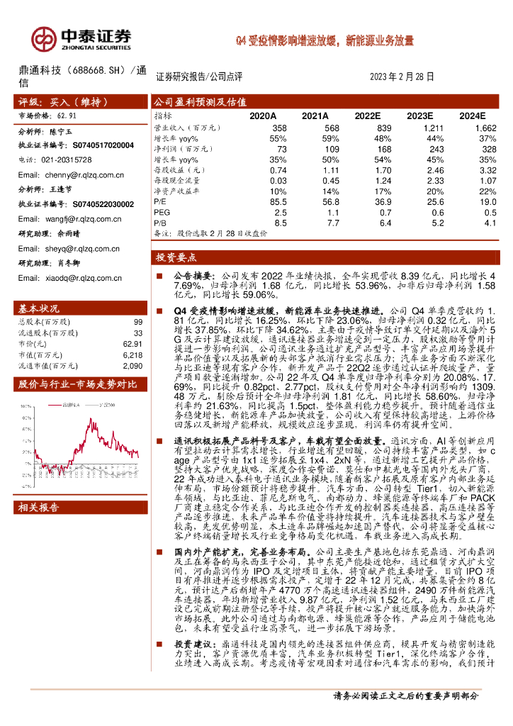 中泰证券:鼎通科技(688668)-Q4受疫情影响增速放缓,新能源业务放量.pdf