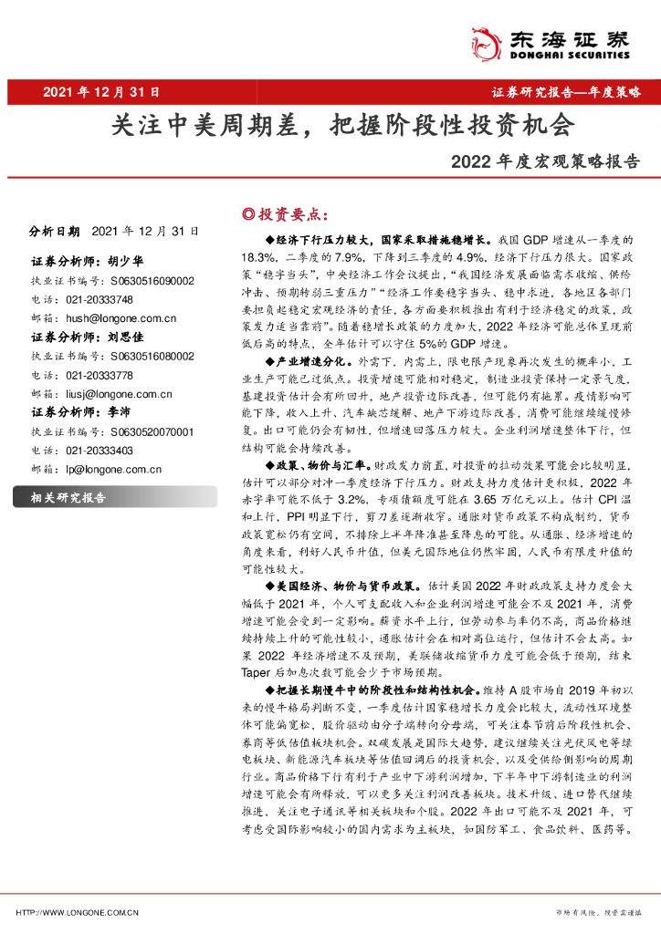 东海证券:2022年度宏观策略报告:关注中美周期差,把握阶段性投资机会.pdf