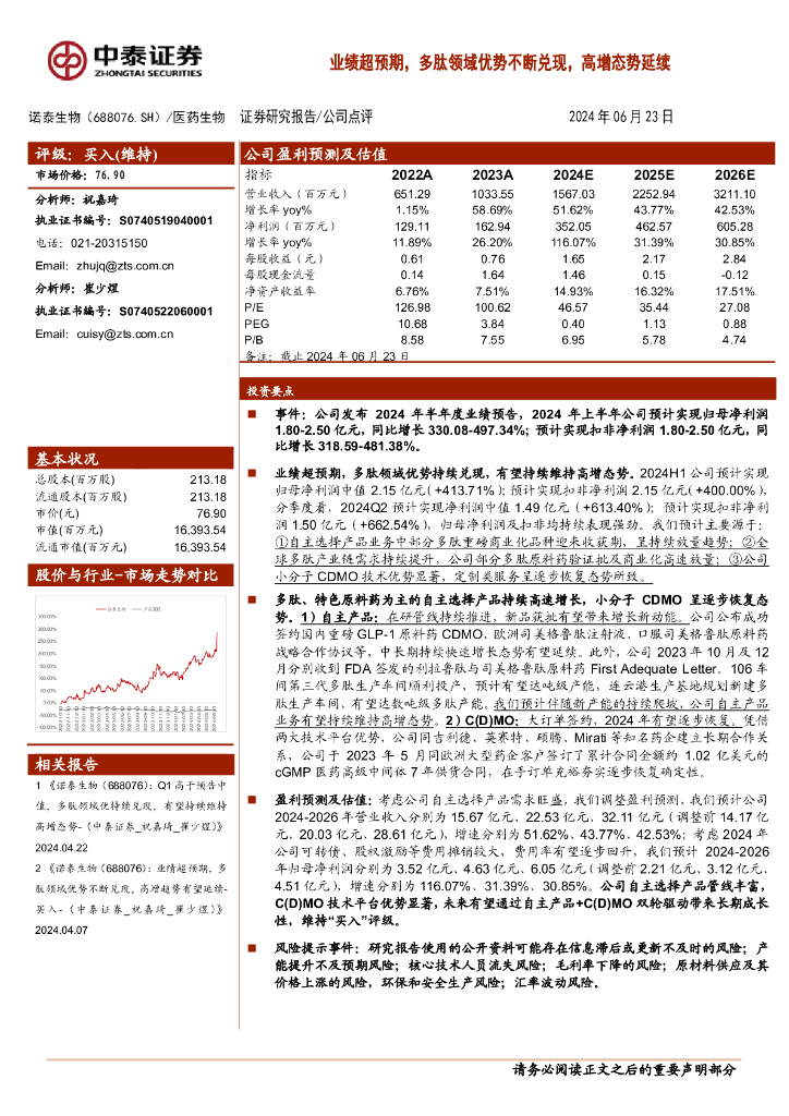 中泰证券:诺泰生物(688076)-业绩超预期,多肽领域优势不断兑现,高增态势延续.pdf