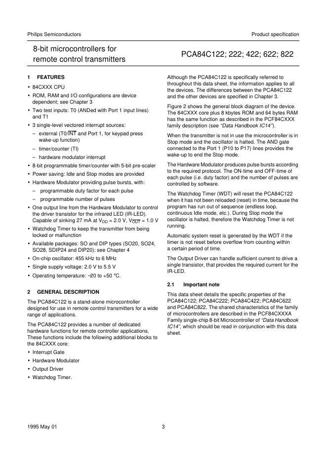 PHILIPS PCA84C122; 222; 422; 622; 822 8-bit microcontrollers for remote control transmitters 数据手册.pdf