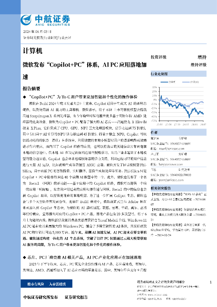 中航证券:计算机:微软发布“Copilot+PC”体系,AIPC应用落地加速.pdf